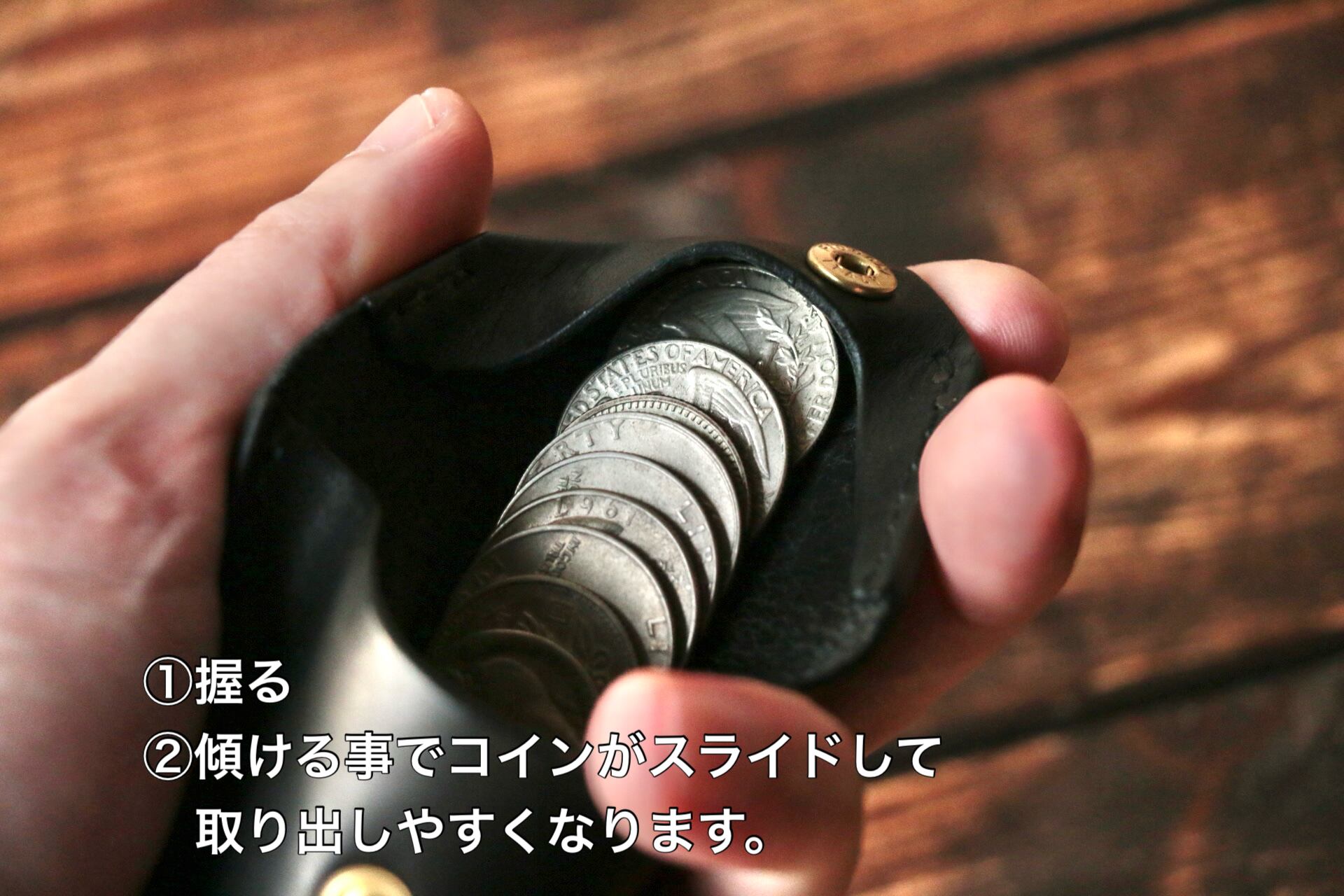 スライドでコインが取り出しやすいよう設計しました。シンプルな作りですが、返しの部分の形状にこだわり、握ることで自然に膨らみやすいようになっています。