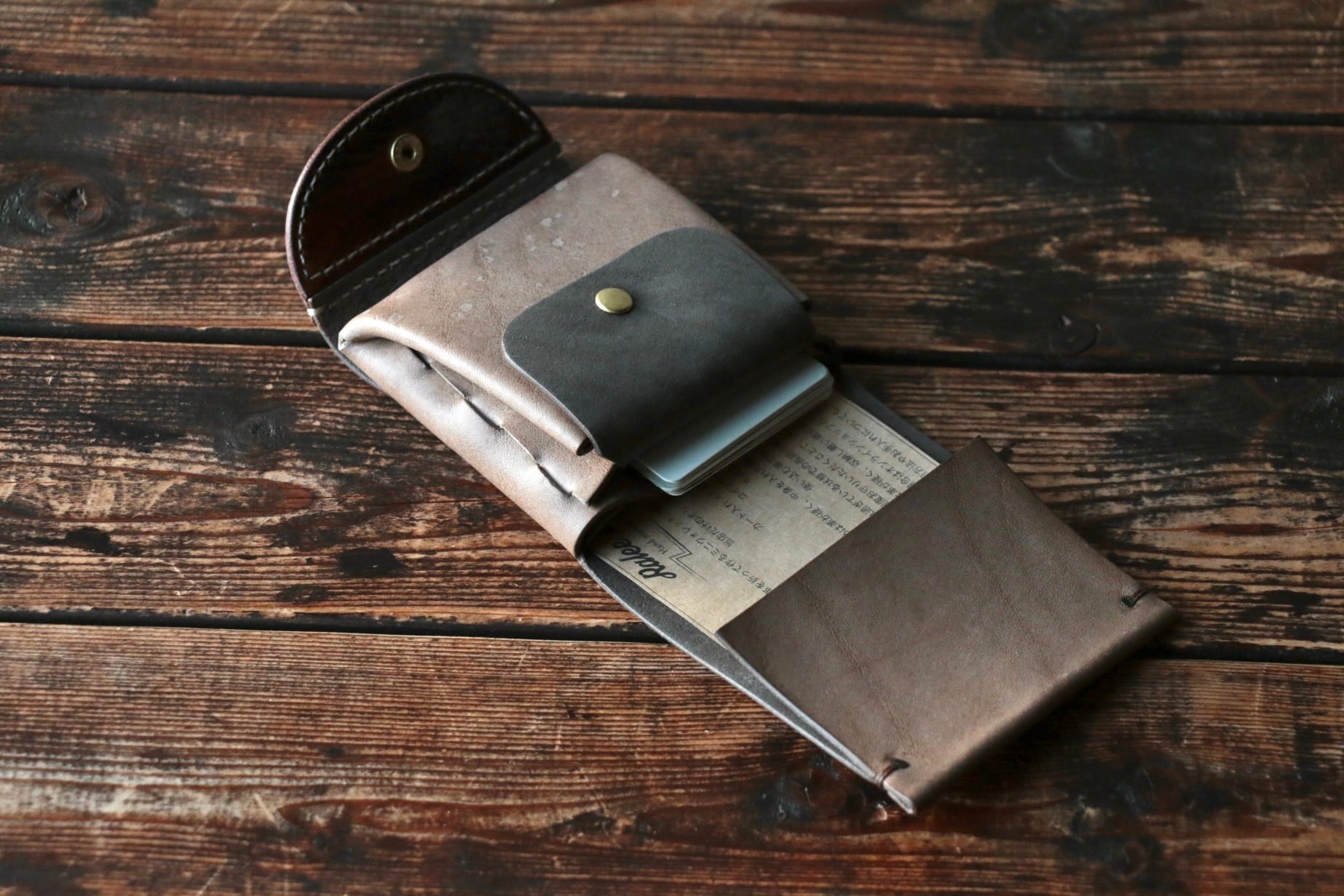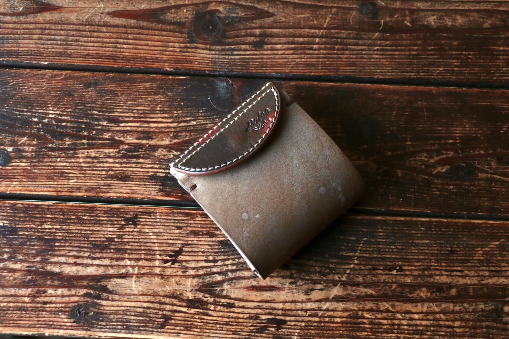 一枚革を折って作るお財布をベースにフラップを取り入れたデザインです。