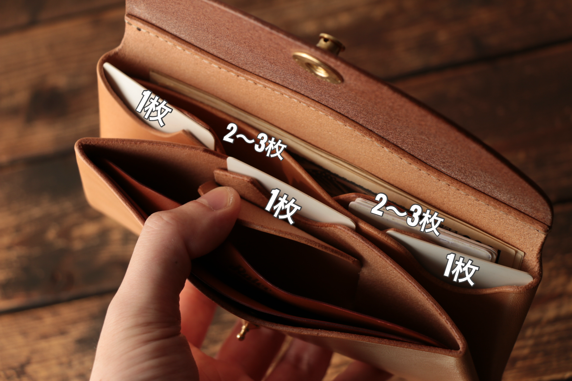 カードは7枚〜10枚程度。ご使用のカードの厚みで収納枚数に差が出る場合がございますのでご了承ください。使い始めは革が固いので、2〜3枚収納できるポケットで枚数を調整してください。