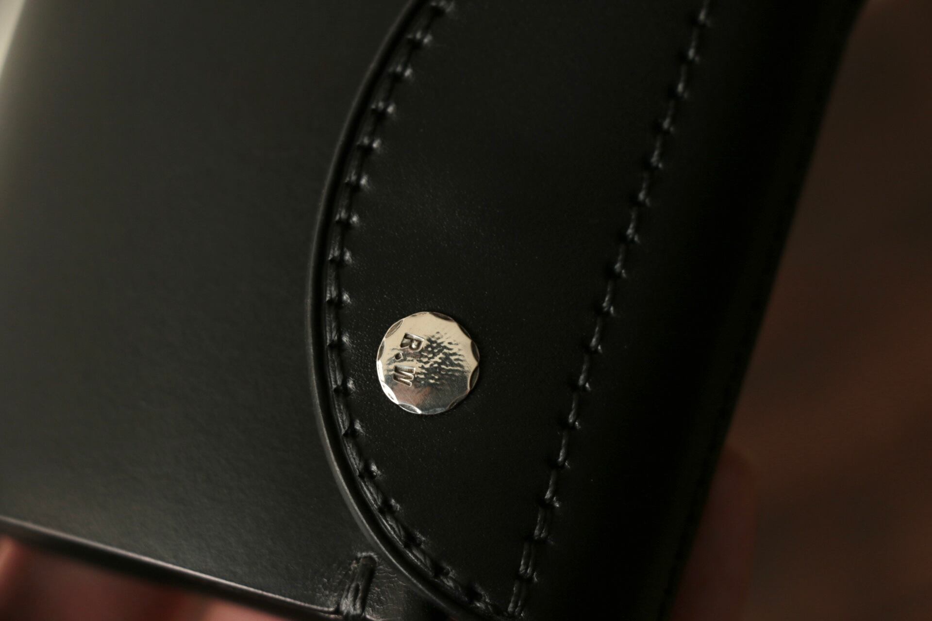 フタ部分にはハンドメイドで製作したsilver925製のオリジナルリベットを取り付けています。フチに手作業で叩きを入れており一つとして同じ形がないのも特徴です。汚れやくすみが気になる場合はシルバー磨きなどでお手入れして下さい。革と共にエイジングをお楽しみいただけます。
