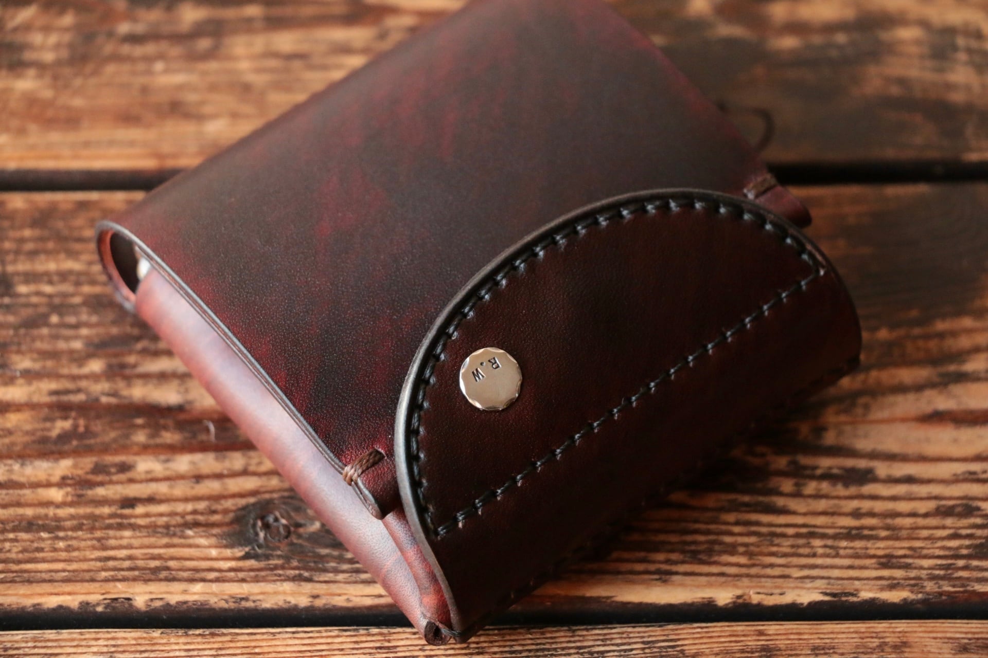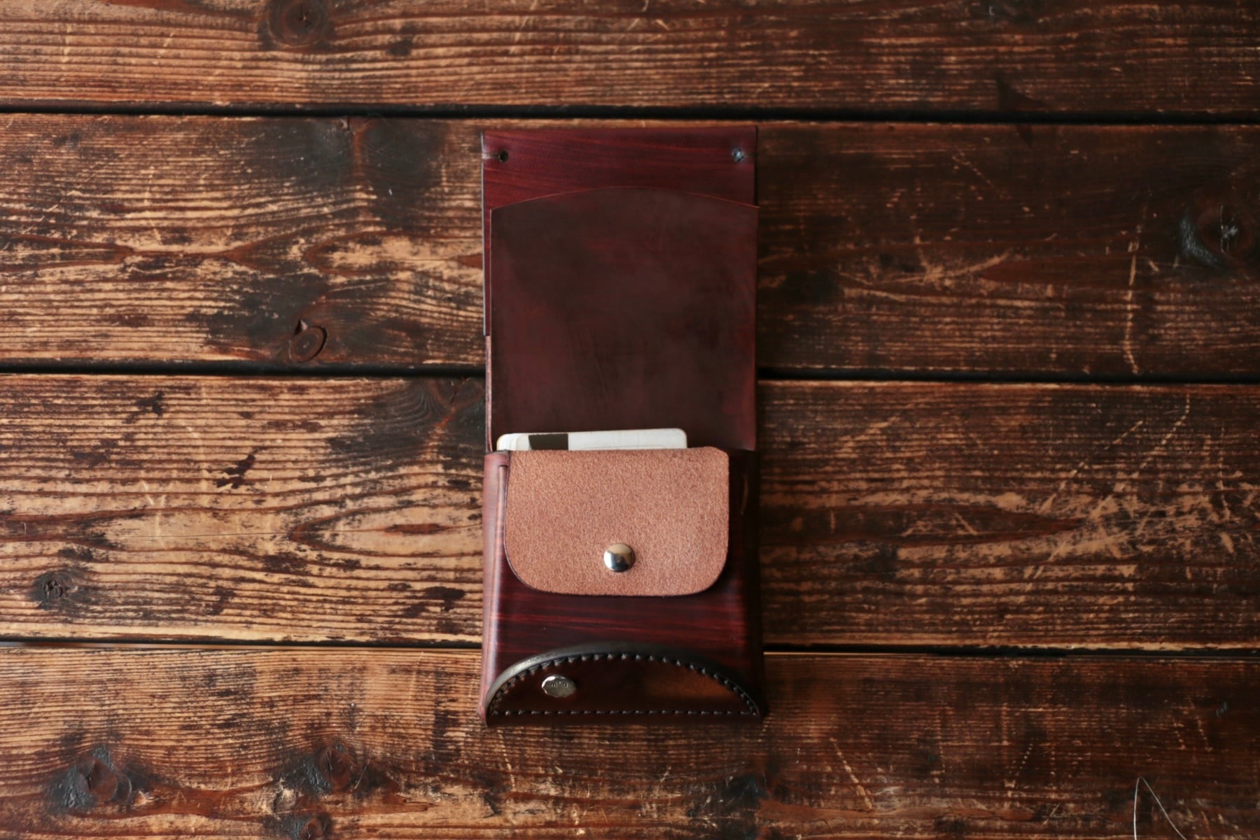 使い始めは革が硬くカードの出し入れやフタが固く感じられますが、使い込む事で徐々に馴染んでいきます。