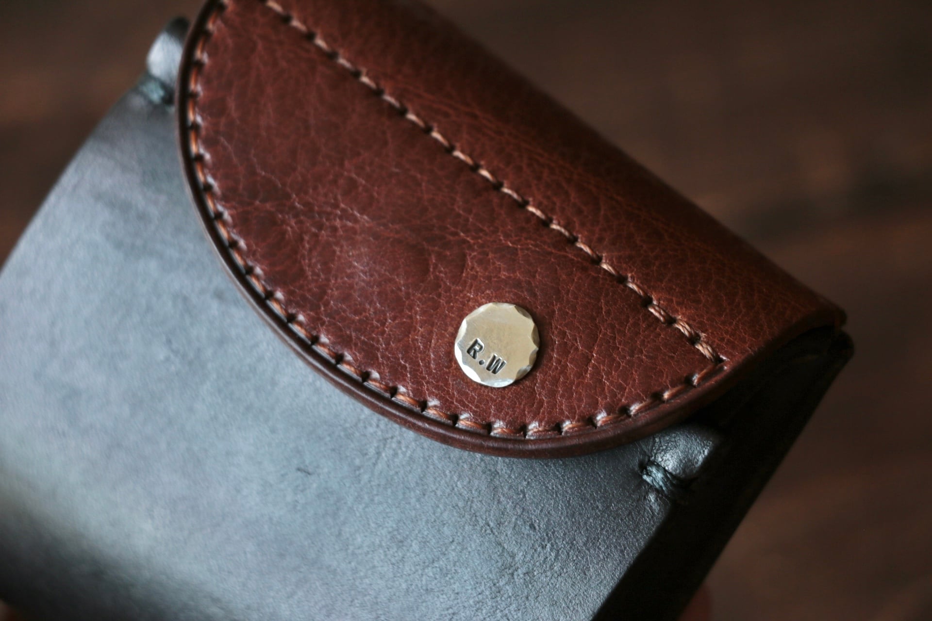 フタ部分にはハンドメイドで製作したsilver925製のオリジナルリベットを取り付けています。フチに手作業で叩きを入れており一つとして同じ形がないのも特徴です。汚れやくすみが気になる場合はシルバー磨きなどでお手入れして下さい。革と共にエイジングをお楽しみいただけます。