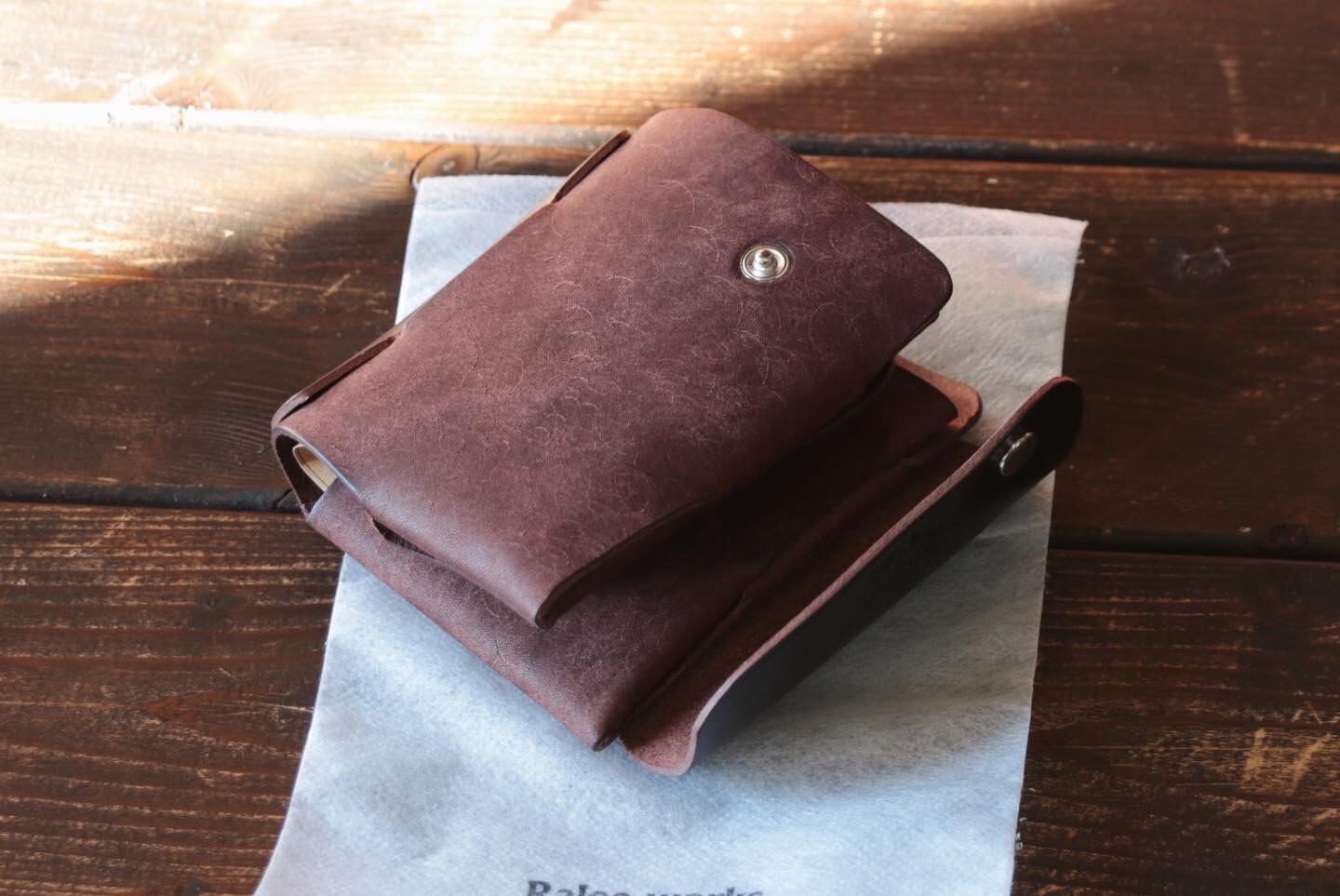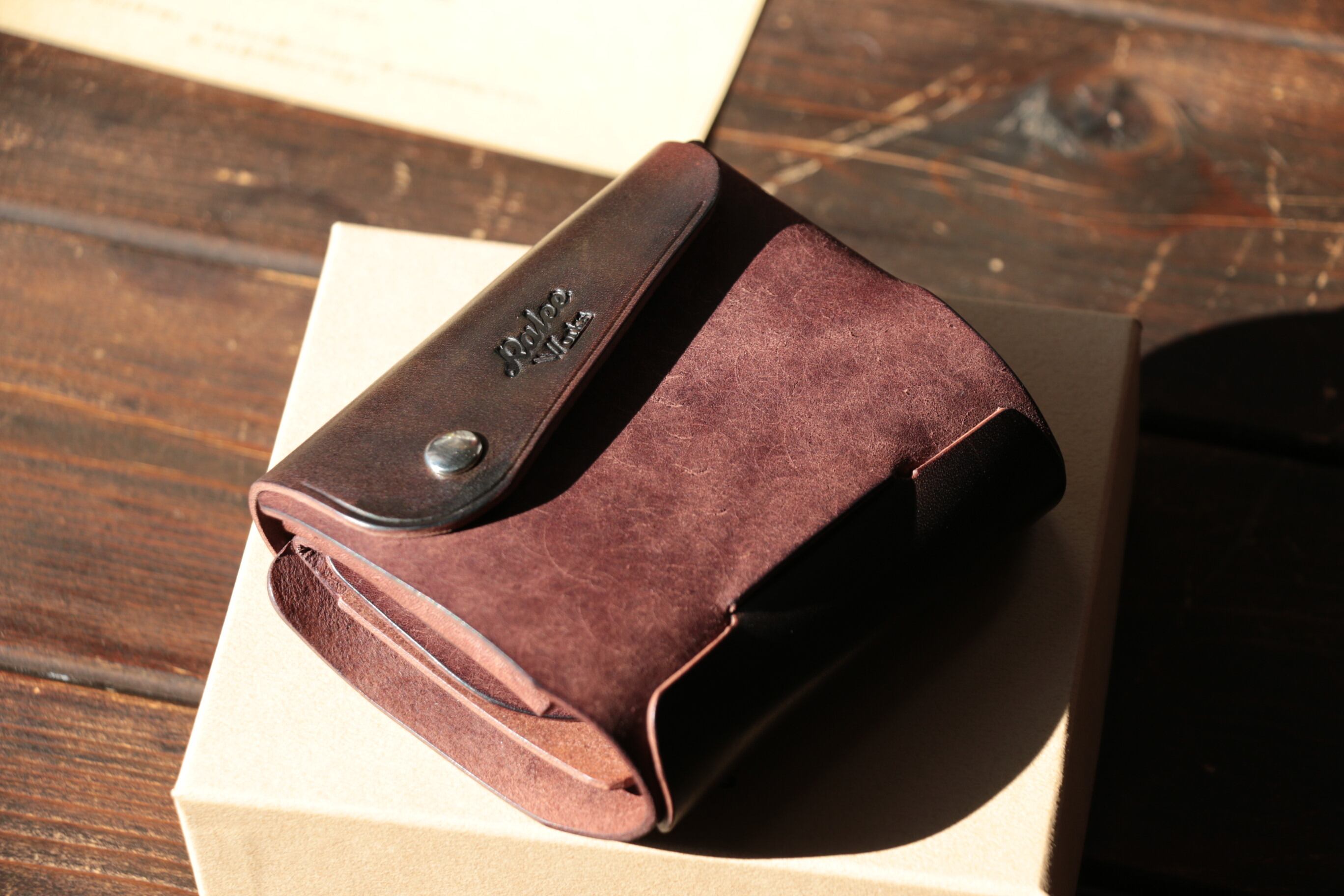 オールハンドメイドの折って作るコンパクトウォレット。2枚の革を折り込み噛み合わせる事で製作しています。