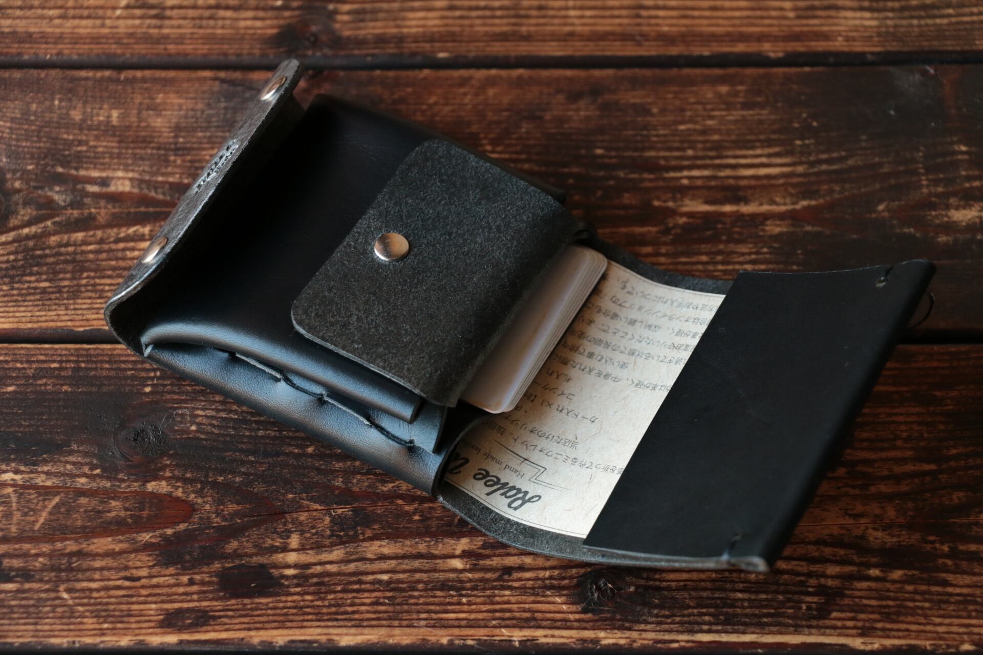 使い始めは革が硬くカードの出し入れやフタが固く感じられますが、使い込む事で徐々に馴染んでいきます。