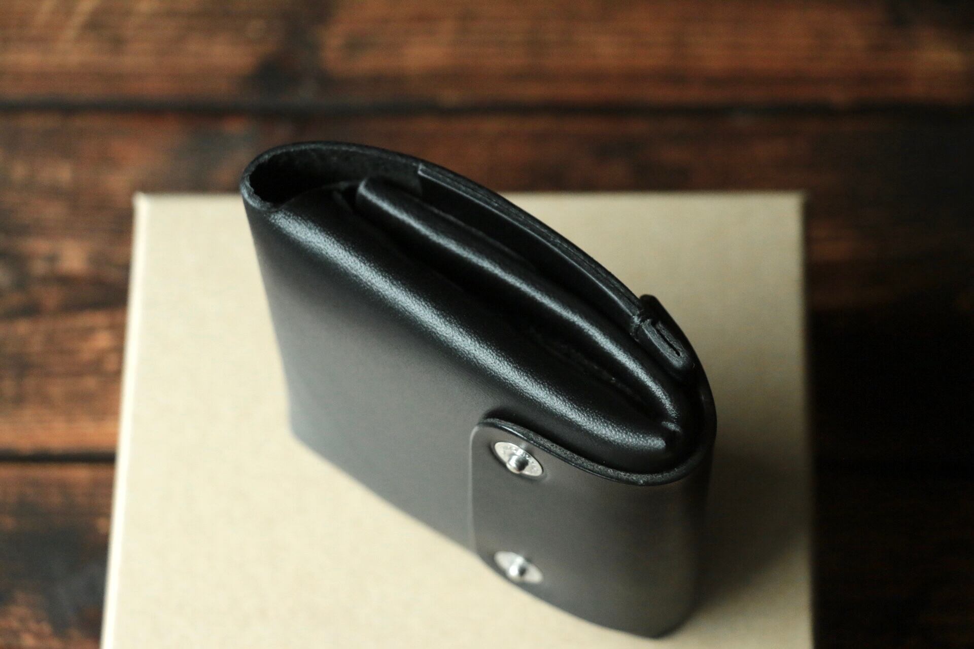 使い始めは革が硬くカードの出し入れやフタが固く感じられますが、使い込む事で徐々に馴染んでいきます。
