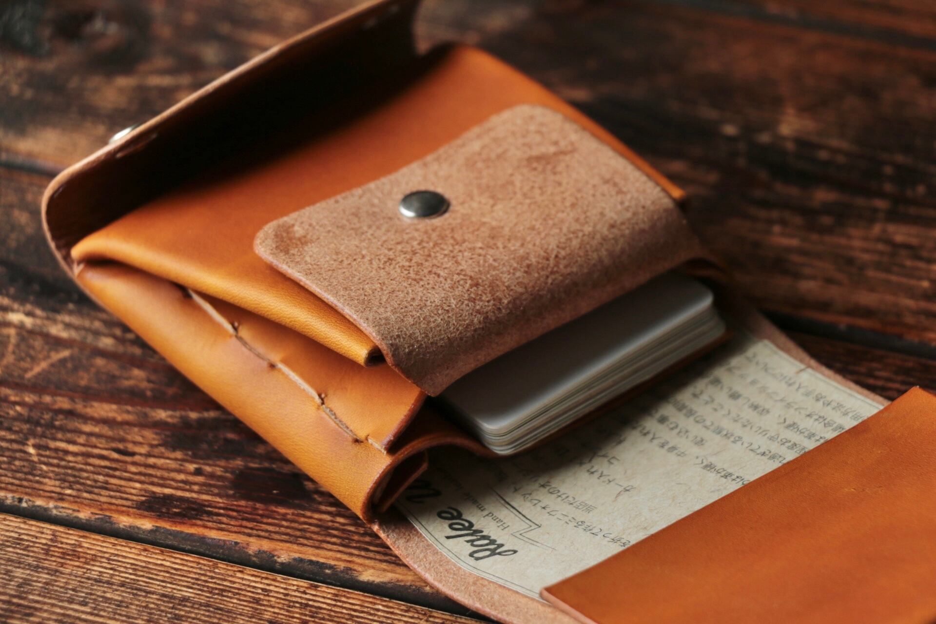 使い始めは革が硬くカードの出し入れやフタが固く感じられますが、使い込む事で徐々に馴染んでいきます。