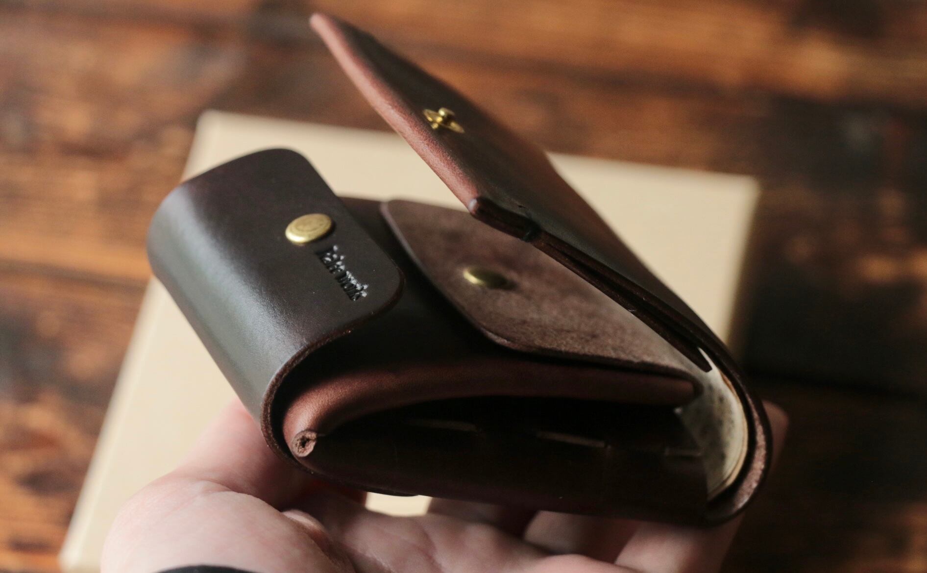 使い始めは革が硬くカードの出し入れやフタが固く感じられますが、使い込む事で徐々に馴染んでいきます。