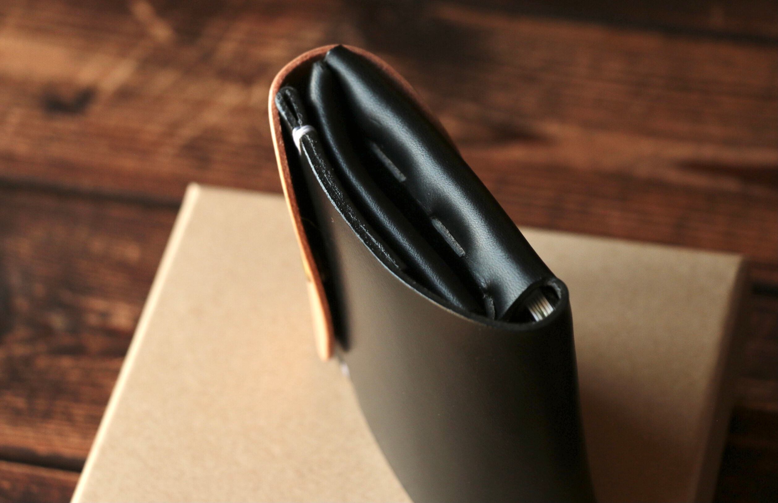 使い始めは革が硬くカードの出し入れやフタが固く感じられますが、使い込む事で徐々に馴染んでいきます。