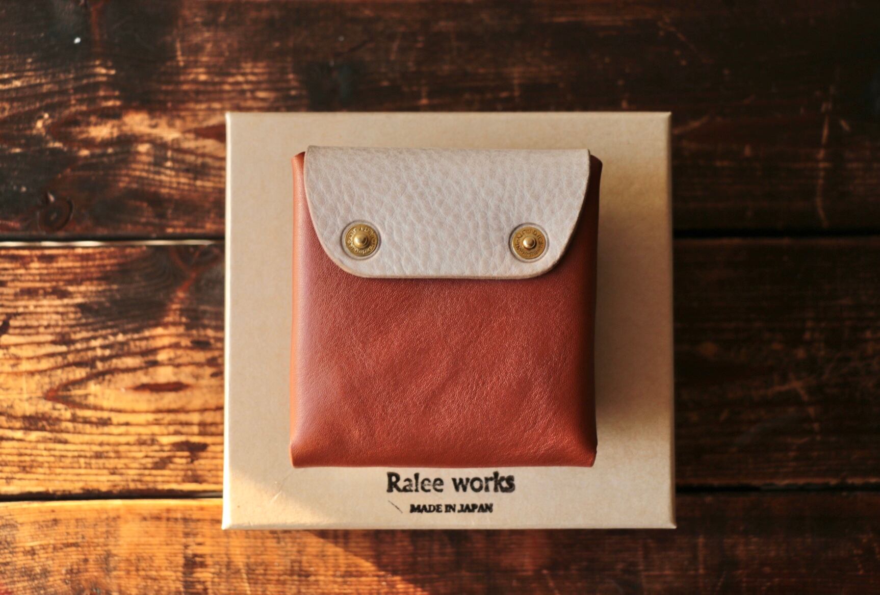 フタ部分はイタリアンレザーアラスカという革です。表面に白いワックスが施されていて、使い込むことで徐々にワックスが取れていき濃い色へ変化していきます。