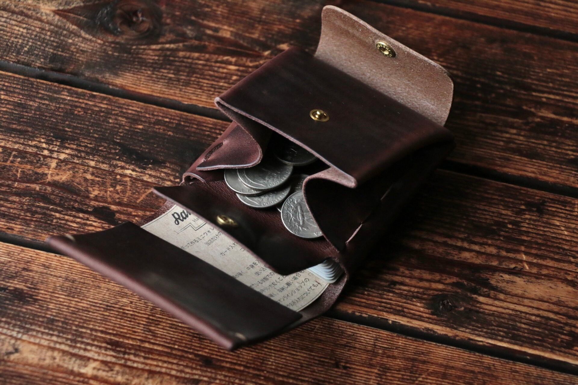 使い始めは革が硬くカードの出し入れやフタが固く感じられますが、使い込む事で徐々に馴染んでいきます。