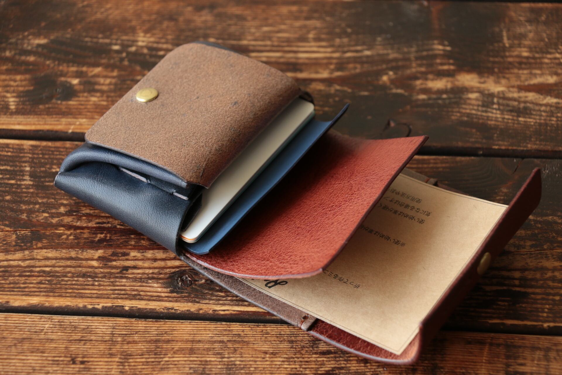 各所に折って作る製法を取り入れてデザインしています。カード収納部の革を引っ張る事でカードが引き出せるデザインになっています。