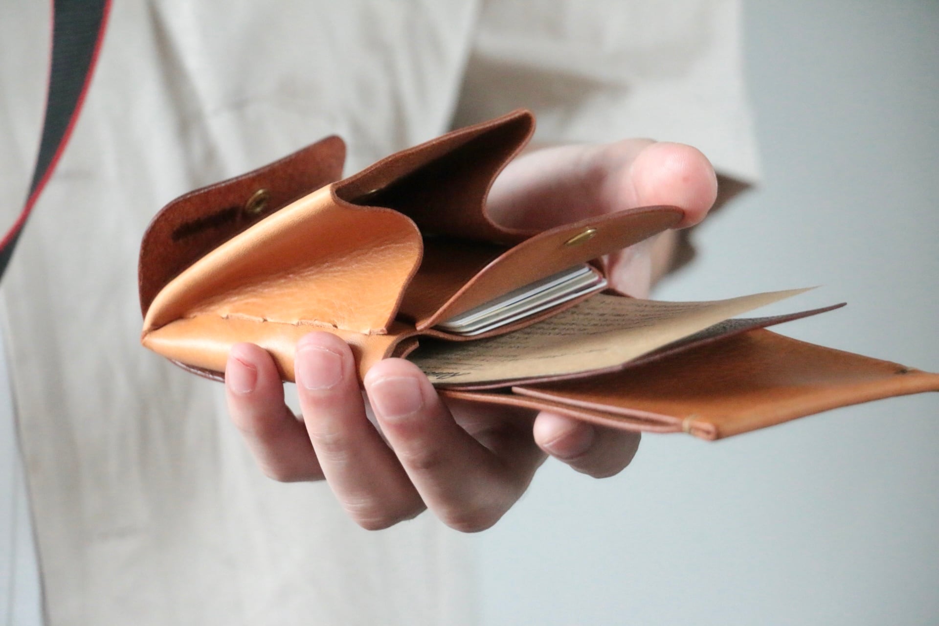 大きな一枚の革を折って複雑に噛み合わせる事で製作しています。当店だけのオリジナルデザインです。 栃木レザー×イタリアンレザー。フタ部分が栃木レザーです。 縫い目は手縫いで仕上げています。 •カラー:ナチュラル •サイズ:(H)高さ95mm (W)幅185mm (D)奥行約25mm(金具部分含まず) •素材:栃木レザー×イタリアンレザー【フルべタブルタンニン鞣し】 •内装 :コインケース×1、カード入れ×5、札入れ×1 革を折り、一つ一つ手作業で作り上げています。使い込む事で、革の経年変化をより深く味わう事が出来ます。 使い始めは革が硬くカードの出し入れやフタの開閉が固く感じられますが、使い込む事で徐々に馴染んでいきます。 ATTENTION(注意事項) ★ 商品写真と実物で色が多少違う場合があります。モニターや光の当たり方でも明るさが変わる場合がございます。素材の仕入れ時期によっても色が多少変わる可能性がありますので、天然素材の特性としてご理解ください。 ★ 天然素材のため傷やこすれ、トラ目と呼ばれる模様などが含まれる場合があります。天然素材の特性としてご理解ください。